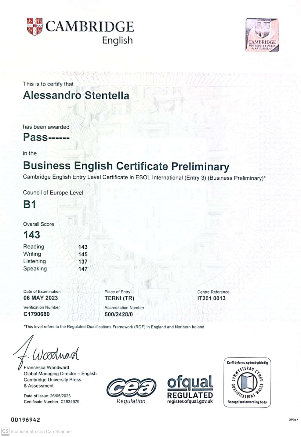 Partecipazione al corso BEC - Business English Certificate, della durata complessiva di 30 ore, con medesimo esame finale superato con livello B1
